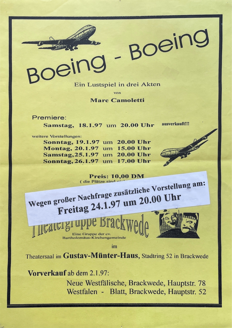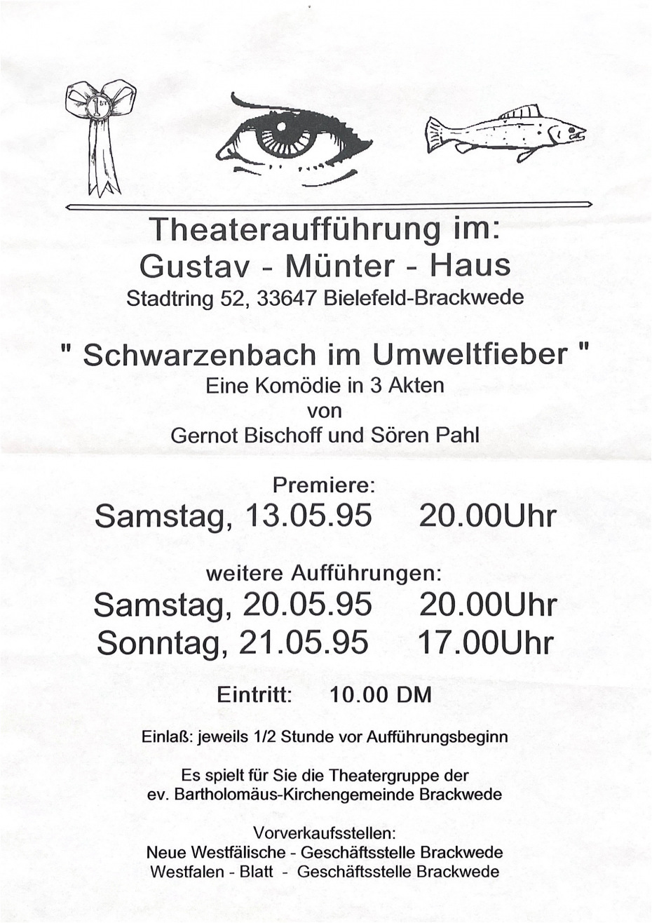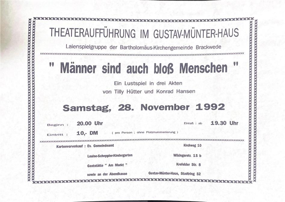 Das Theater Brackwede wurde 1989 ins Leben gerufen – anfangs mit kleinen Sketchen und Auftritten auf Gemeindefesten. Schon früh war klar: Die Leidenschaft für das Theater ist groß. 1992 folgte dann das erste abendfüllende Stück – ein Meilenstein, der den Grundstein für unsere heutige Ausrichtung legte.