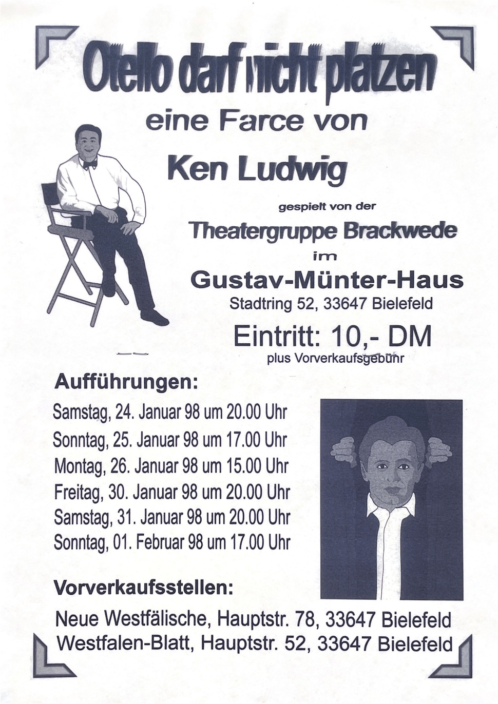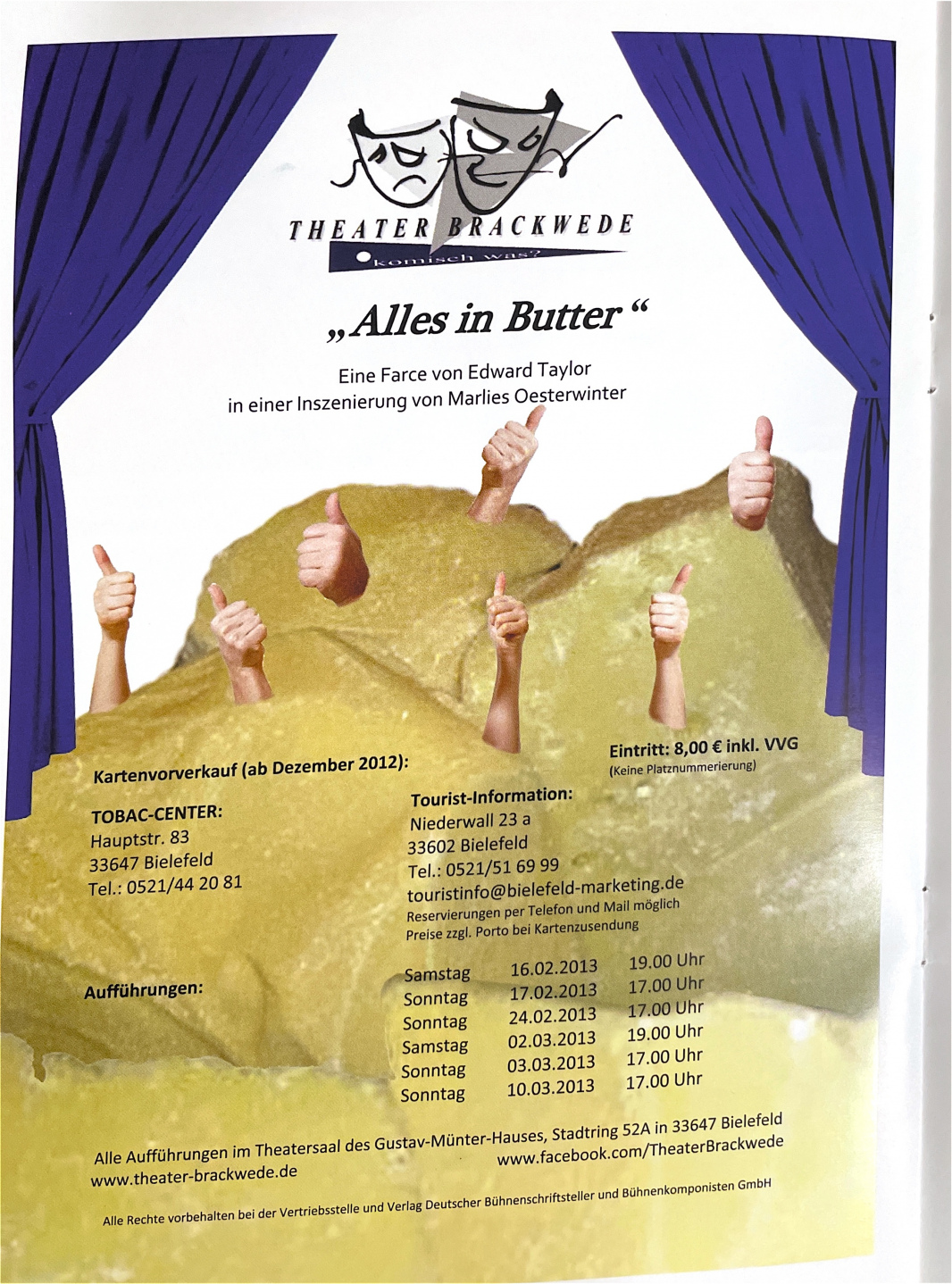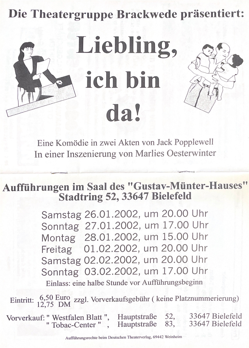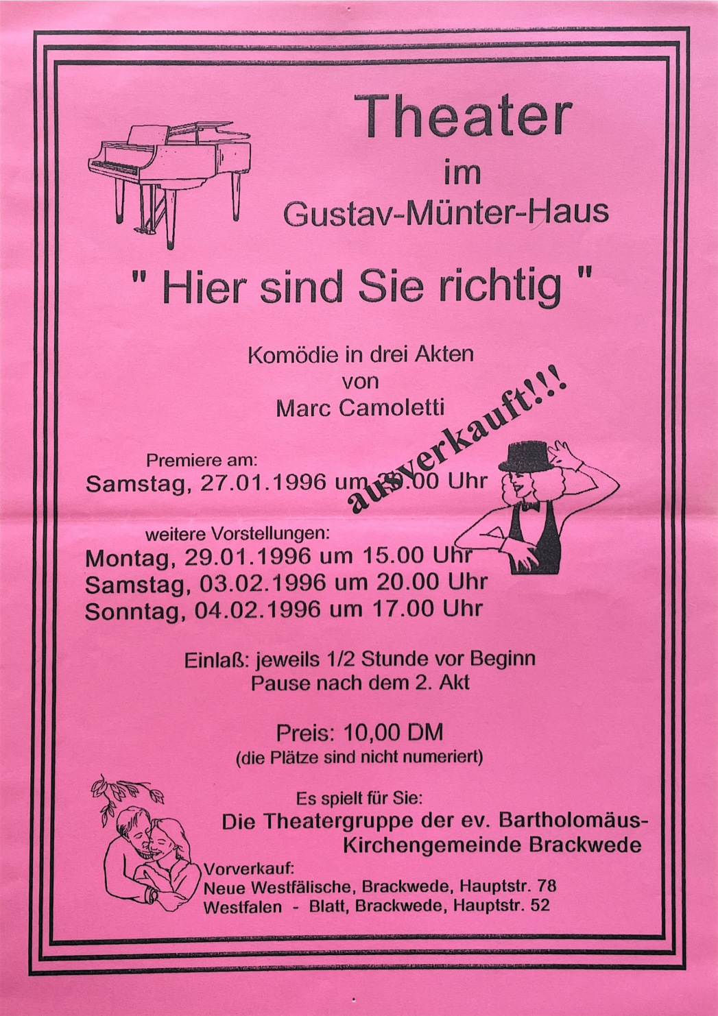 Das Theater Brackwede wurde 1989 ins Leben gerufen – anfangs mit kleinen Sketchen und Auftritten auf Gemeindefesten. Schon früh war klar: Die Leidenschaft für das Theater ist groß. 1992 folgte dann das erste abendfüllende Stück – ein Meilenstein, der den Grundstein für unsere heutige Ausrichtung legte.