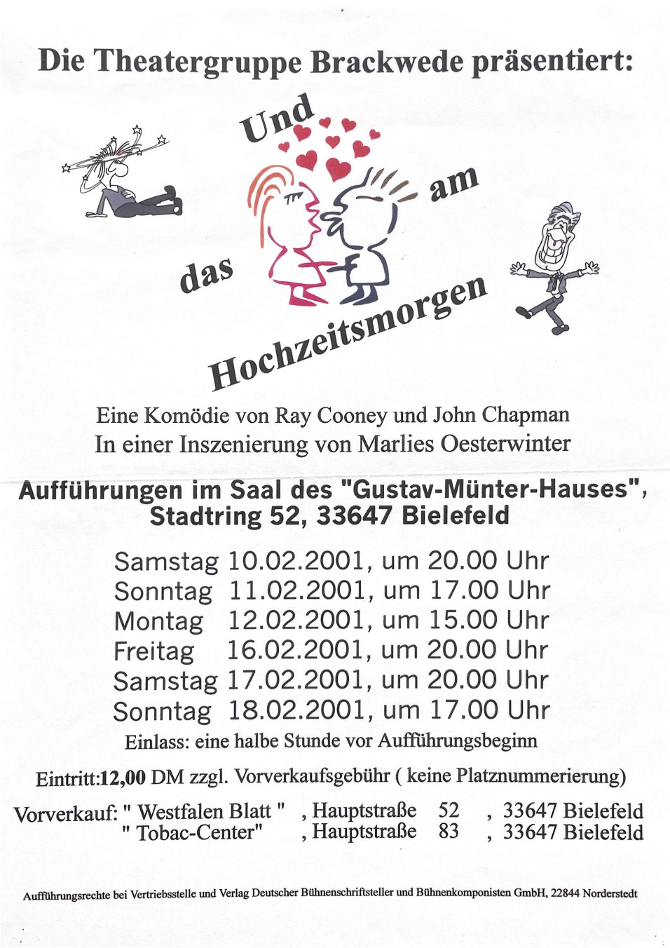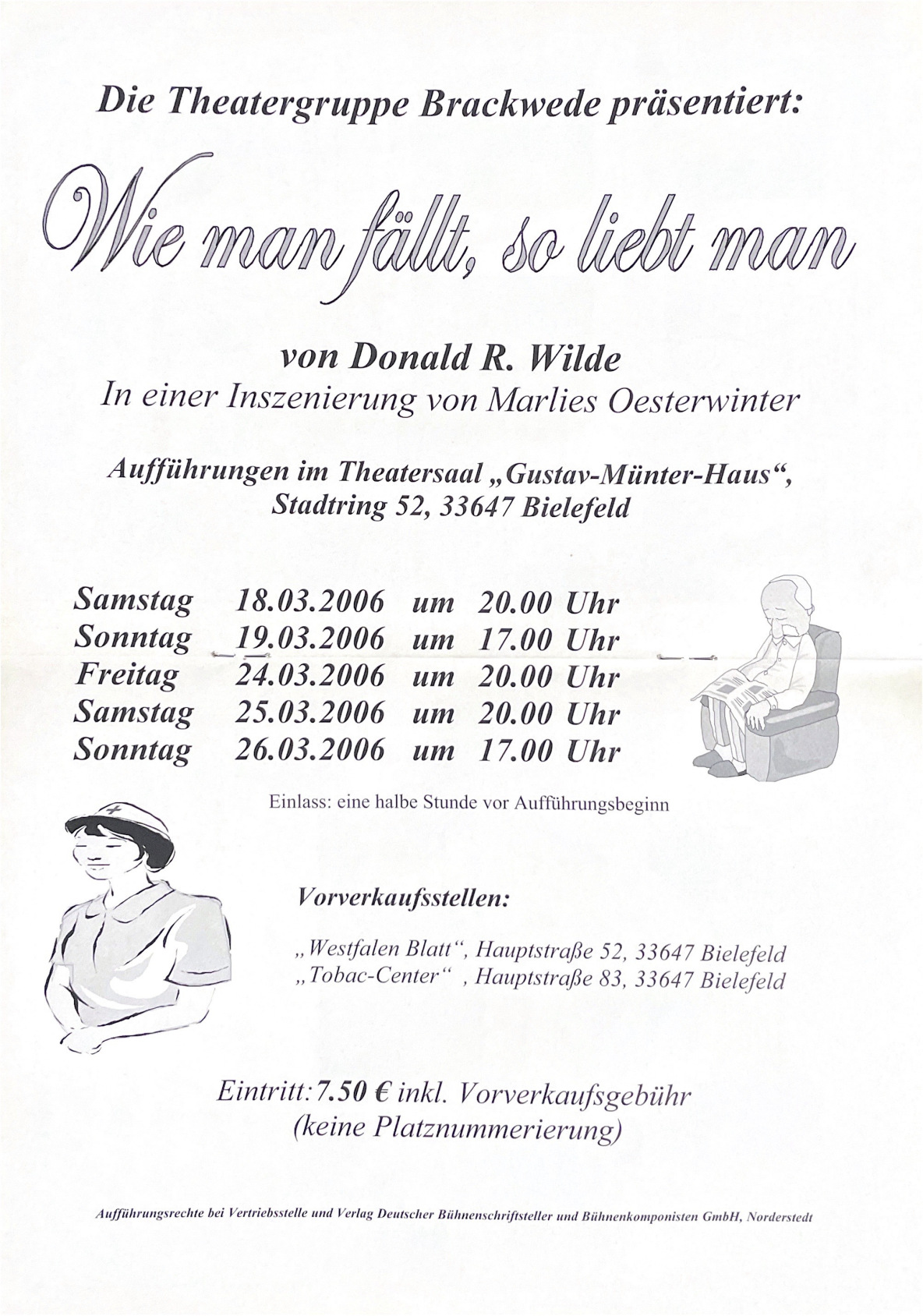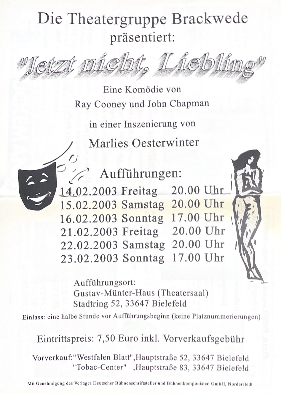 Das Theater Brackwede wurde 1989 ins Leben gerufen – anfangs mit kleinen Sketchen und Auftritten auf Gemeindefesten. Schon früh war klar: Die Leidenschaft für das Theater ist groß. 1992 folgte dann das erste abendfüllende Stück – ein Meilenstein, der den Grundstein für unsere heutige Ausrichtung legte.